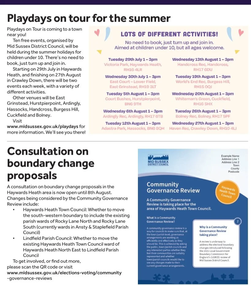 A consultation on boundary change proposals in the Haywards Heath area is now open until 8th August. Changes being considered by the Community Governance Review include: